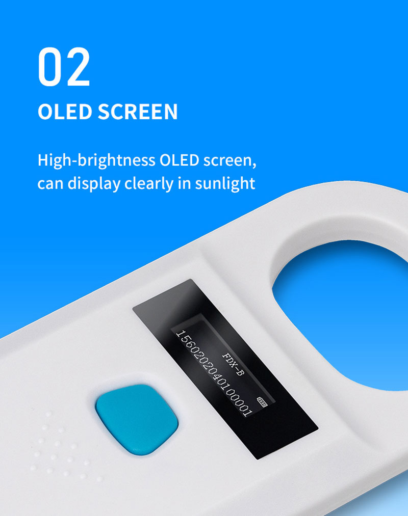 Úsáideann an scanóir seo taispeáint OLED ard-ghile atá le feiceáil go soiléir i dtimpeallacht solais gheal. Is féidir leis uasmhéid 128 taifead d'fhaisnéis chlib a stóráil lena chuimhne ionsuite, is féidir le húsáideoirí an fhaisnéis a uaslódáil chuig an ríomhaire trí chábla USB.
